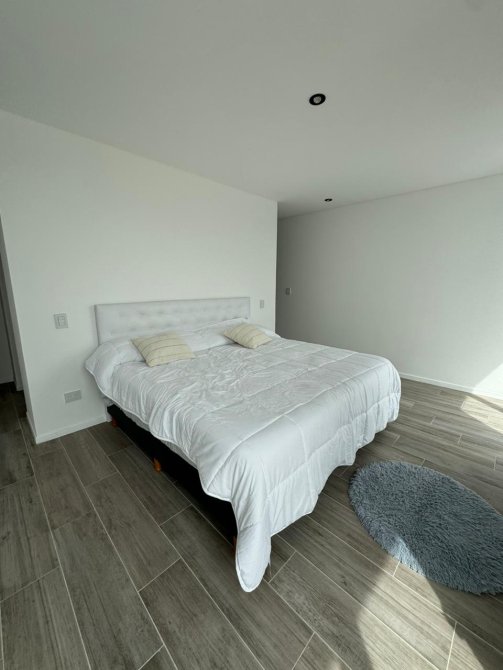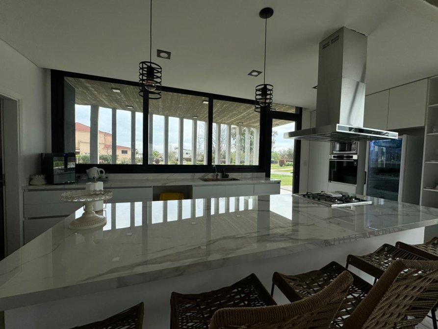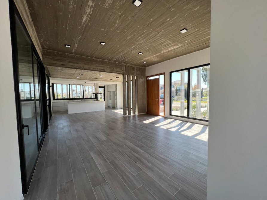 La casa se desarrolla totalmente en planta baja, con su acceso principal al living. A continuación hacia la derecha el comedor, cocina con isla (realizada de estuario, neolith). Con anafe y extractor en acero inoxidable. Lavadero independiente.