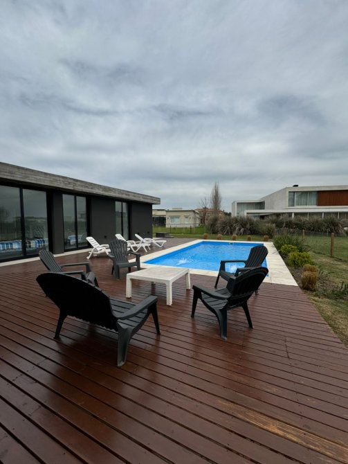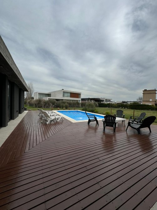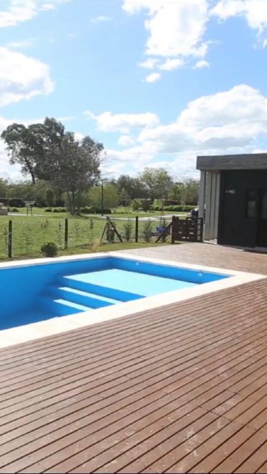 Fondo parquizado, piscina rodeada con deck de madera. Quincho semicubierto con parrilla y lavadero.