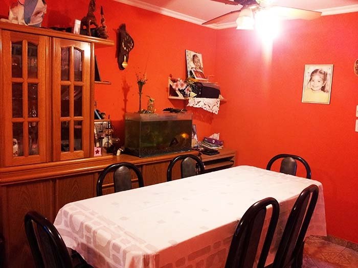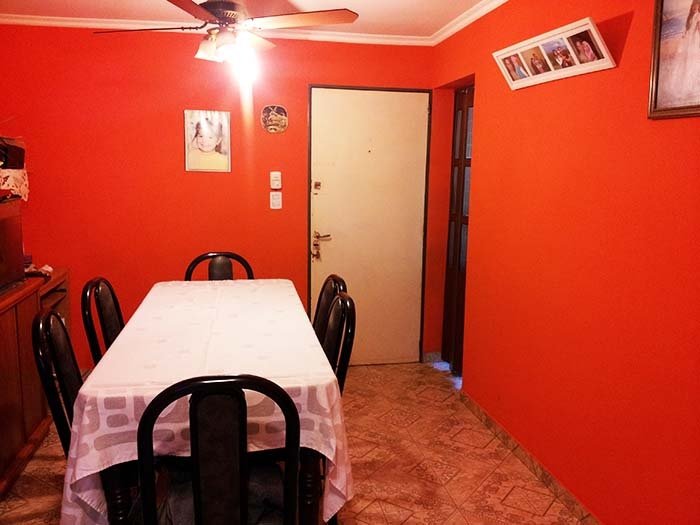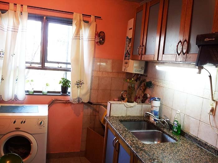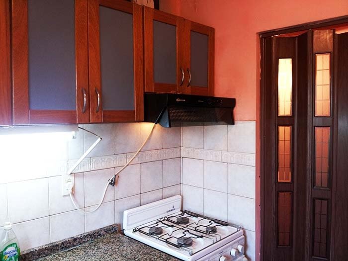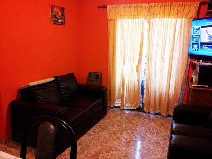 Living comedor con pisos cerámicos, estufa de tiro balanceado y salida hacia balcón, cocina con muebles bajo y sobre mesada, baño completo y 3 domitorios.