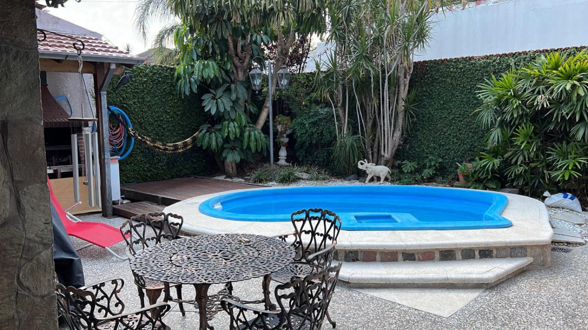 Patio con piscina, quincho con parrilla y baño completo.
